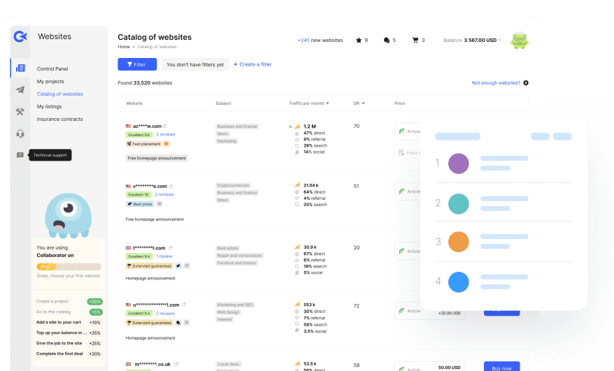 Collaborator is a content marketplace that streamlines the distribution of crypto press releases and sponsored articles by giving its users access to a huge catalog with multiple quality websites in the finance and cryptocurrency industry.